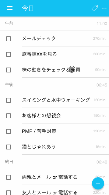 タスクを実行したら、チェックボックスにチェックを入れましょう。チェックを入れると、その日に予定しているタスクの総所要時間から、チェックしたタスクの所要時間がマイナスされます。