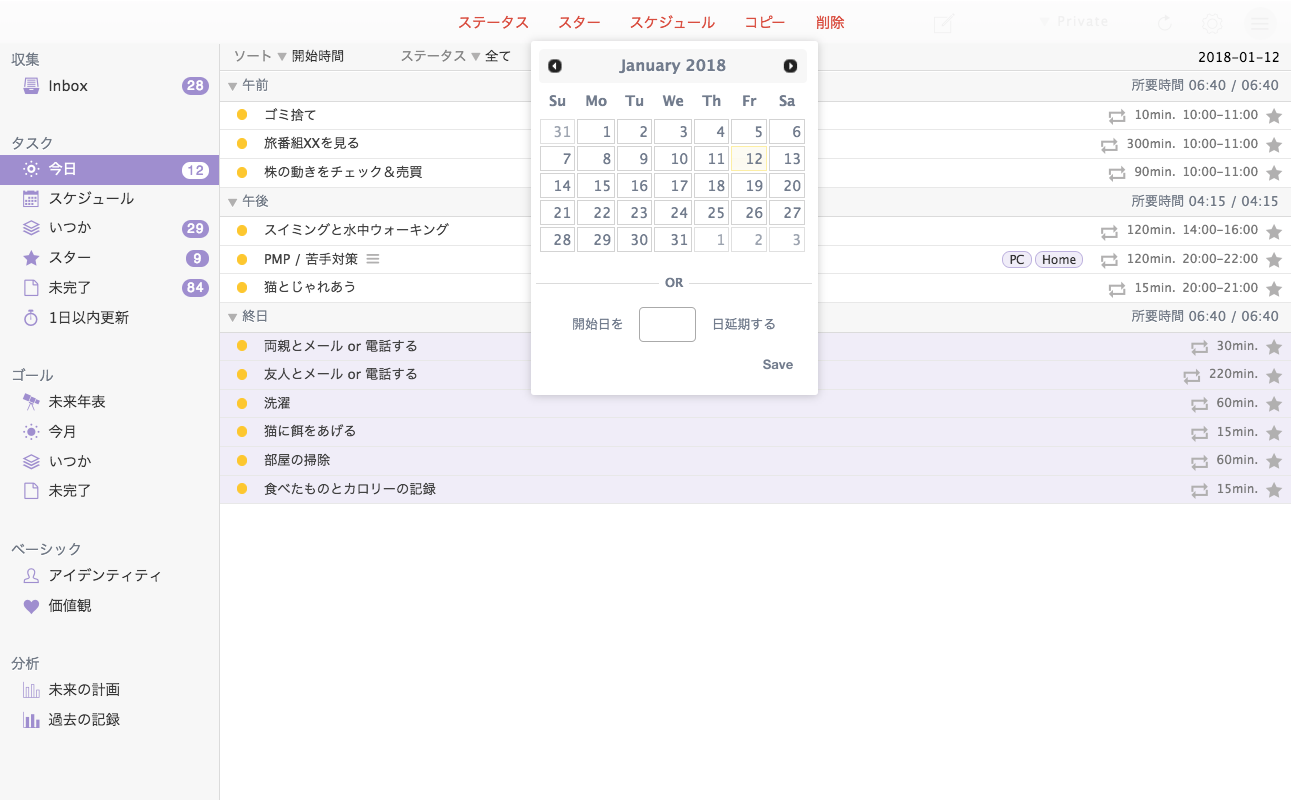 そのため、じっくり腰を据えてゴール・タスク設計を行いたいときはPC版、日常的なタスクの実行管理はモバイル版といった形でPC版/モバイル版の併用を強くお勧めします。